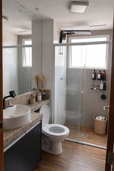 • Banheiro com box, espelho e gabinete